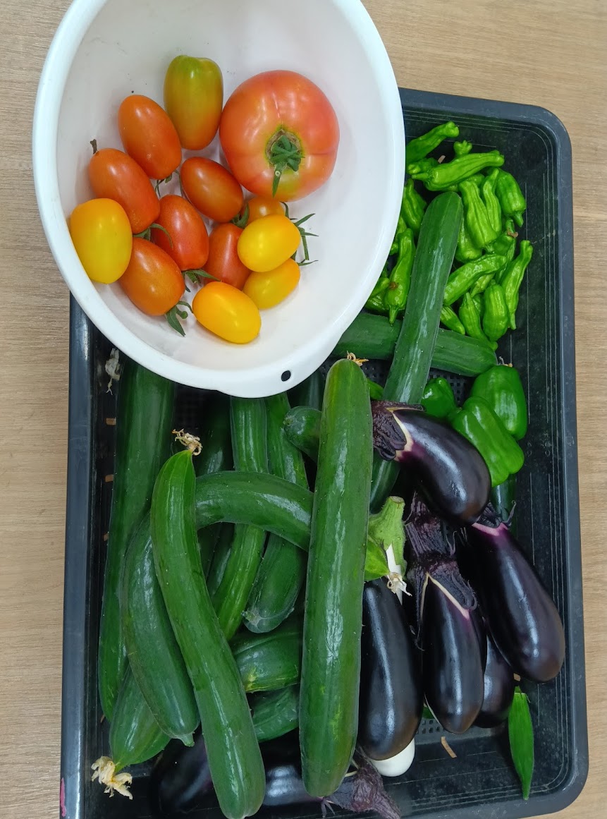 畑は、きゅうり、ズッキーニ、トマトなどが毎日収穫できています。