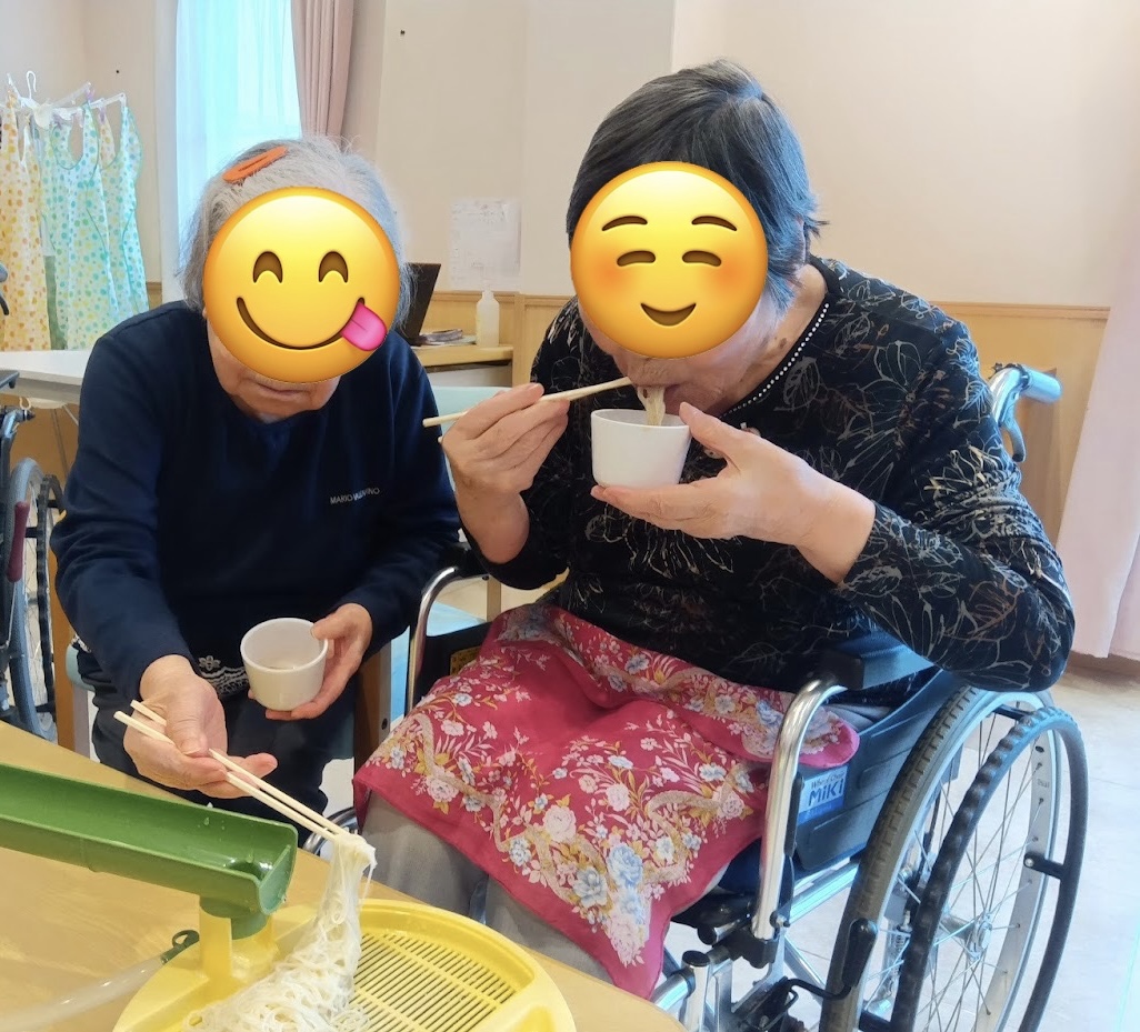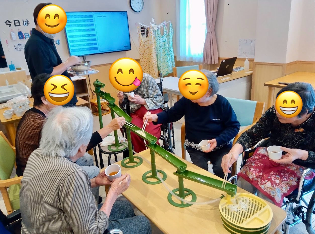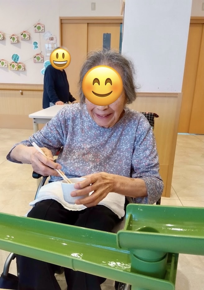 プレオープンに参加しなかった職員はどうやら不安を感じ、3ユニット合同で実施すると連絡がありました。どうしても、そうめんが通り過ぎるのをながめてしまいがちなので、職員が声掛けし介助し入所者さまのペースに合わせながらワイワイやっていました。