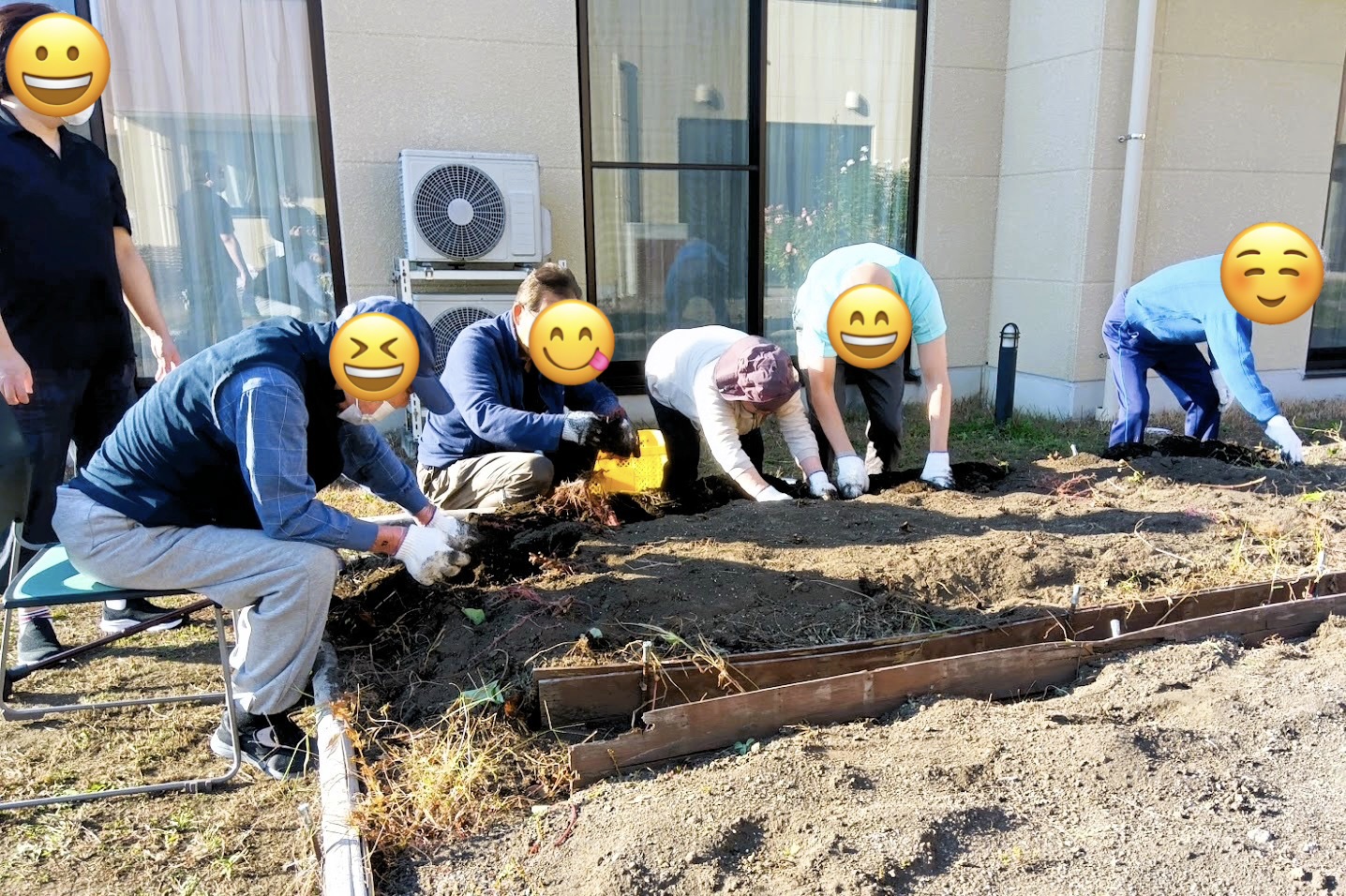 昨年は、大きなサツマイモが取れ過ぎたので、ケアマネさんが苗の植え方を工夫して大きくなりずらいように作付けを行いました。葉の様子をみながら収穫時期を決めますが、今年は昨年に比べ1月遅い収穫となりました。生活相談員さんが、12月19日に焼いもを計画しています。毎年恒例の焼いもを、入所者さまに喜んでいただければと思います。
