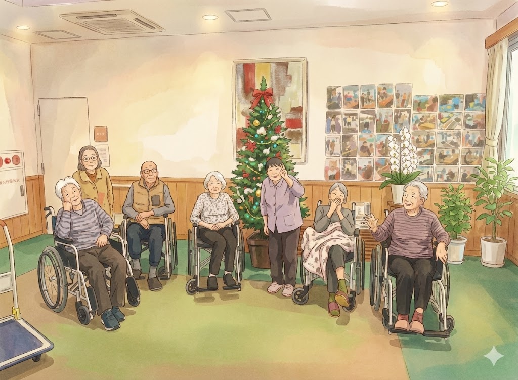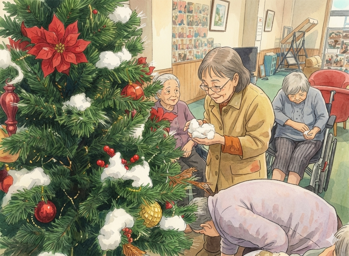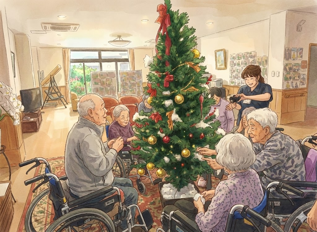 管理栄養士さんとケアマネさんが、入所者さまや介護職員さんと相談して、クリスマスツリーの飾りつけを実施しました。ケアマネさんが率先して、準備を行います。色とりどりの飾りや綿を入所者さまに渡し、飾っていただきます。30分程度で飾り終わり、点灯式を行いました。