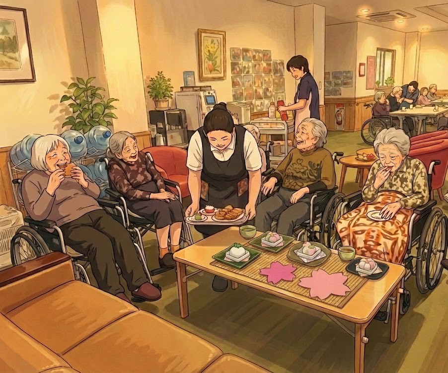 地域交流スペースには約40名の方が集まれます、交代で多くの入所者さまに来ていただき普段交流の少ない入所者さまとも会話を楽しんでおりました。珈琲や紅茶などを好まれる方には、別途お飲み物をご用意しています。皆様、何を食べようか迷いながら和菓子を選んでおりました。