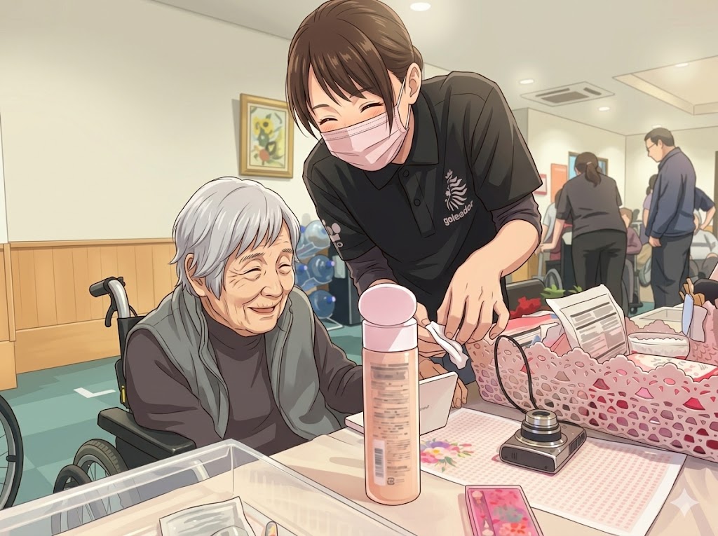 化粧水、乳液などの化粧品は肌にやさしい物を選び購入したとのことです。約50名近くの女性の入所者さまが参加し、入所者さまのメイクアップイベント行いました。多くの方が集まり化粧品が散らばります、わちゃわちゃした雰囲気の中で、笑い声が聞こえてきます。